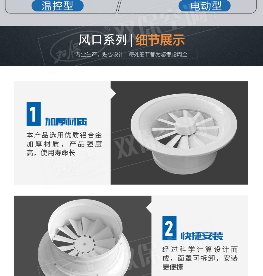 江蘇雙保空調有限公司—旋流風口用于高大空間送風,射程遠。常用于頂送風,可電動或手動調節送風風量。面板為冷軋鍍鋅鋼板,散流圈為深拉沖壓鋁制件,表面為純白色(RAL9010)漆。
