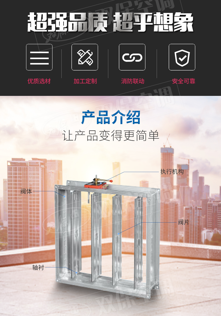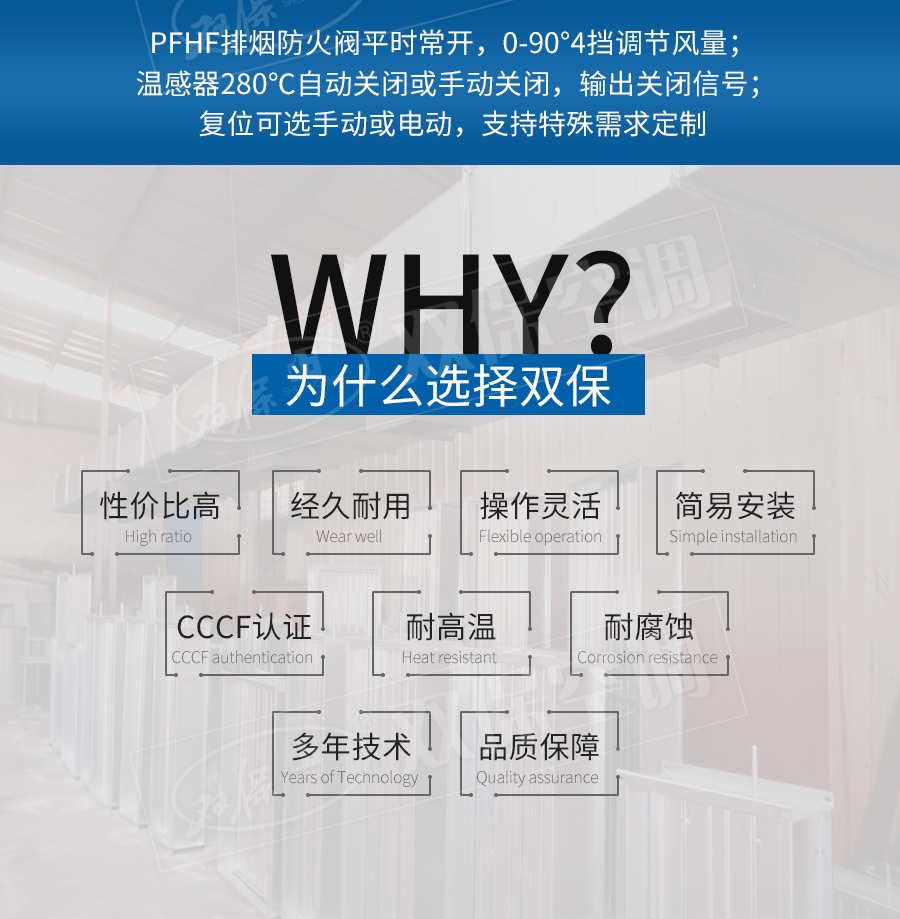 江蘇雙保空調有限公司—排煙防火閥 閥門平時常開; 溫感器280℃自動關閉,手動關閉,輸出關閉信號; 手動復位。